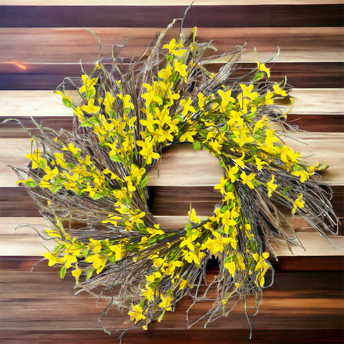 - HIGH QUALITY WREATH: This artificial spring wreath is made of premium plastic. The base is durable natural grapevine full of colorful Forsithya flowers. The entirely realistic wreath has bright color and vibrant looking.