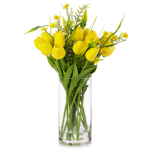 - Package Include: Mixed Tulip and Mini Sunflower Arrangement in Clear Glass Vase With Faux Water